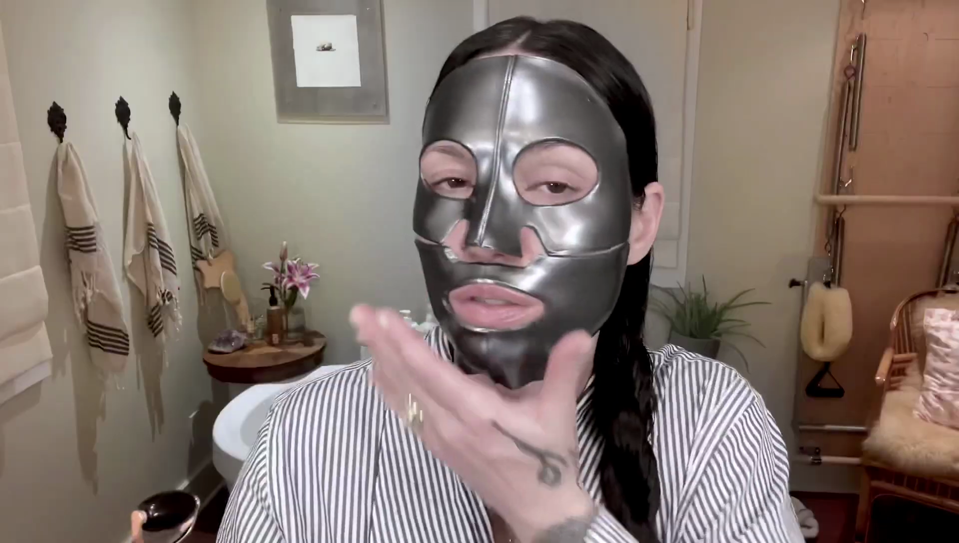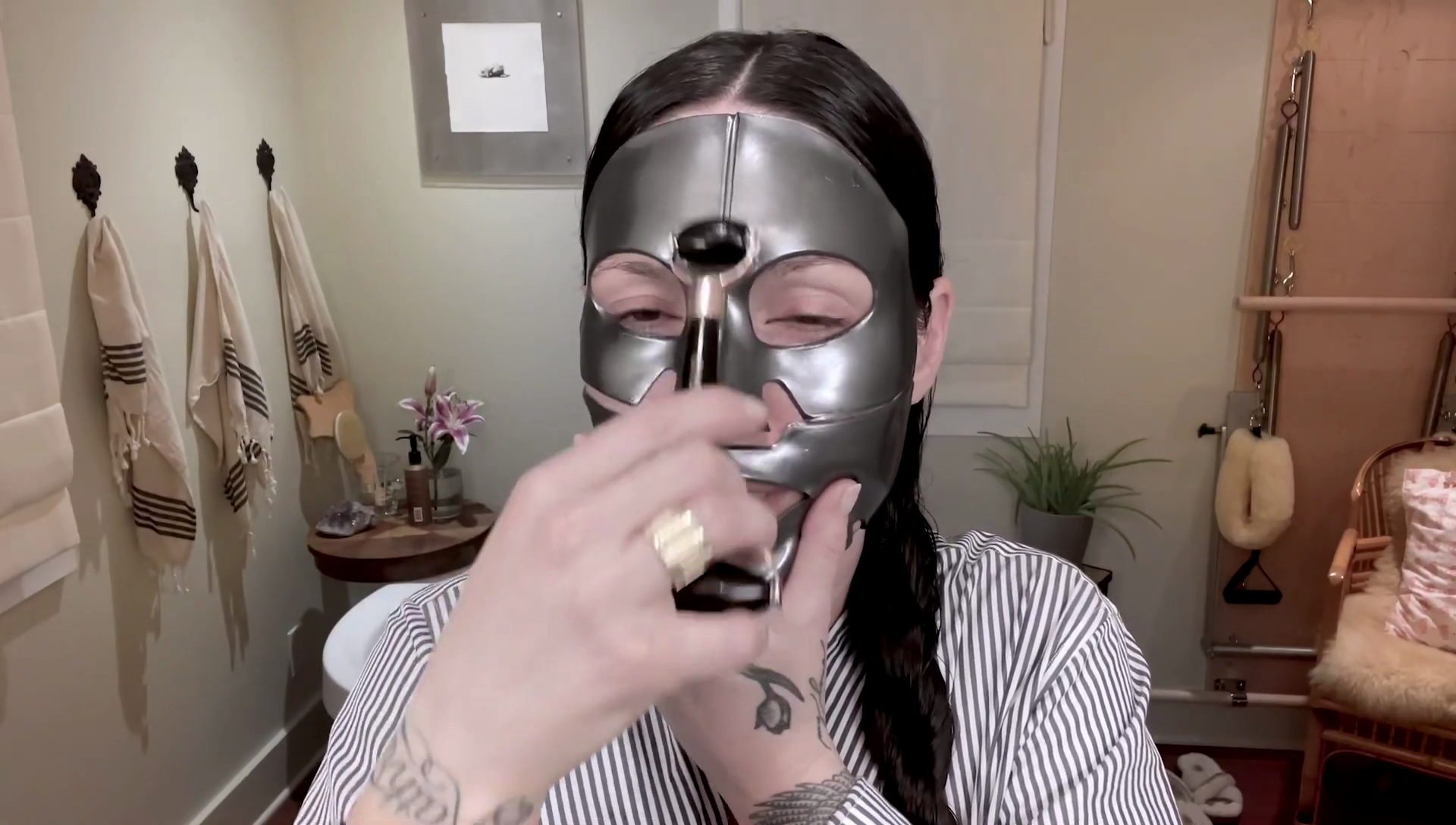 I apply the mask to my skin, and while it heats up on my skins surfac, I use my facial roller by Ildi Pikar to press the product into my skin and promote blood flow. I kind of hold on to the mask and just de-puff under my eye; you can go up onto your forehead and just sort of get rid of all that stress from your day.